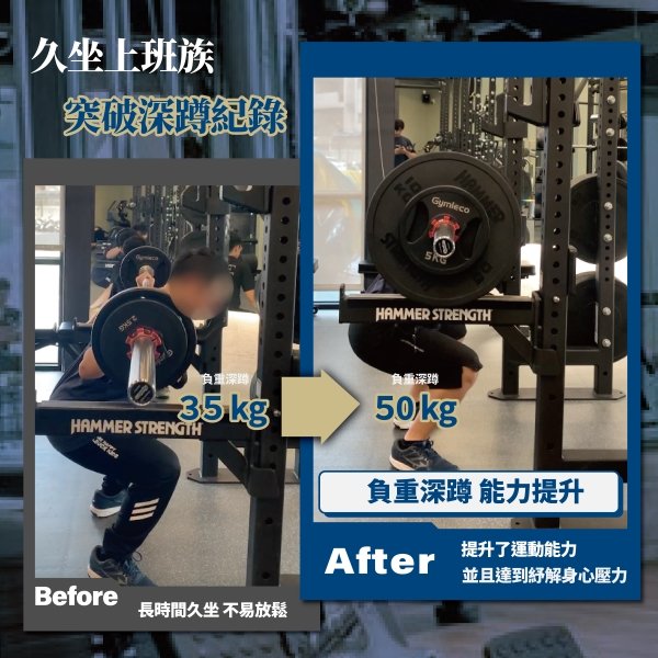 我最喜歡深蹲這個訓練動作,因為可以訓練到久坐的腿部肌群,也漸漸從35kg蹲到現在可以蹲50kg,相信不久就能蹲起自身一倍的重量!