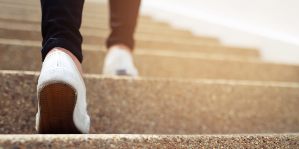 足底筋膜沿著跟腱延伸至小腿,所以如果小腿肌肉過於緊繃的話,也會讓足底筋膜有可能產生過高的張力導致足底筋膜炎的產生,我們可以藉由前腳掌踩在階梯上,腳跟順著往下去延伸我們的小腿,但在做小腿伸展運動前,我們可以先運用泡棉滾筒去放鬆我們的小腿肌肉,來讓小腿肌肉的延展性變好。