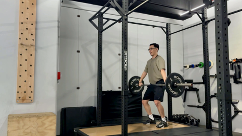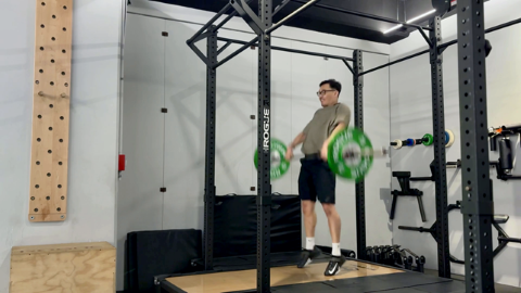 Step3. 保持槓鈴貼近身體,跳躍聳肩,將槓向上拉,手肘向天花板方向靠近。當槓到達胸部高度時,深蹲使身體位於槓下,肘部向前,完成動作。