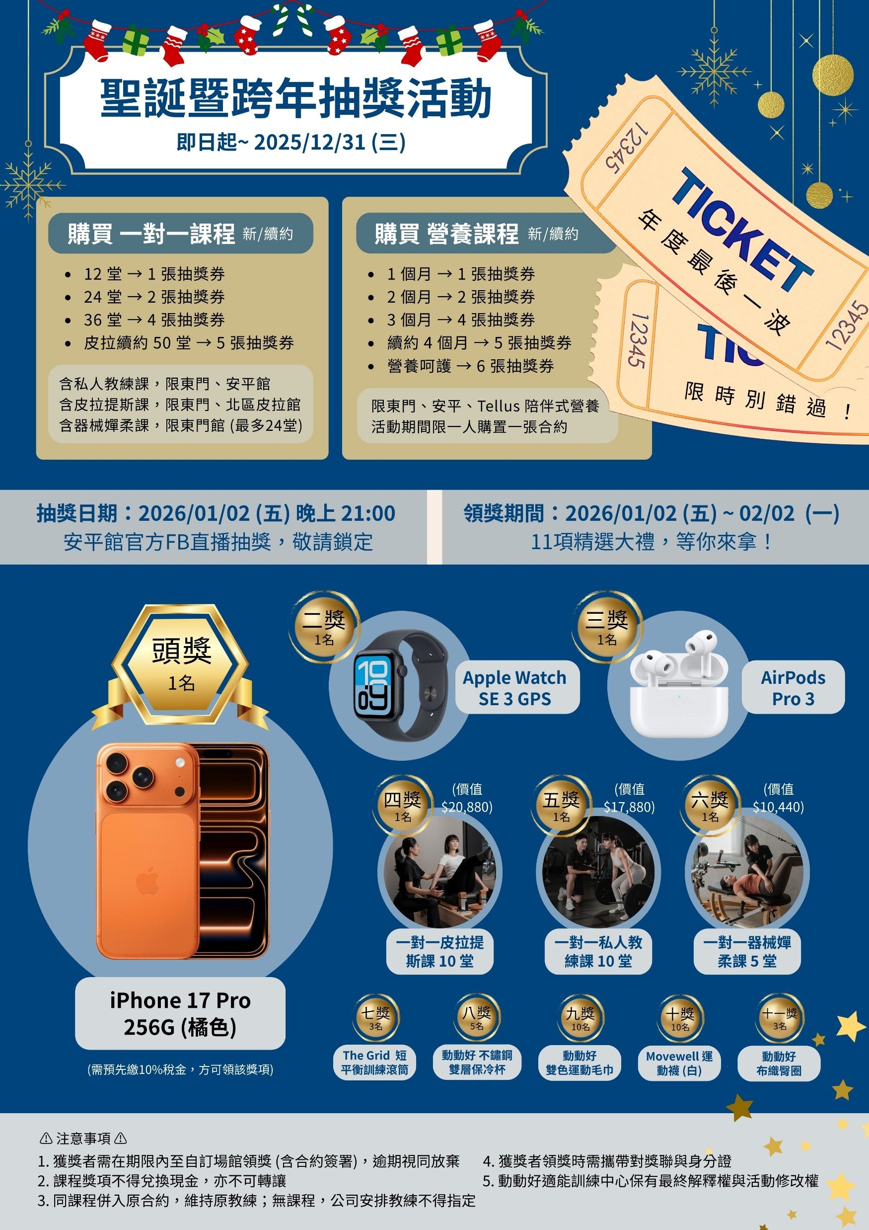 只要在 12 月購課,不只開始變健康,還能直接抽 iPhone 17 Pro、Apple Watch、AirPods Pro 3,總共 37 個獎項等你帶走!🎁