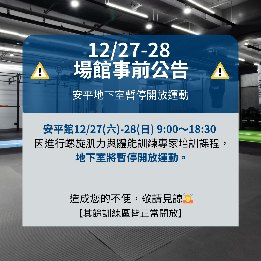 【安平館場地公告】12/27-28 9:00至18:30,因進行螺旋肌力與體能訓練課程, 地下室將暫停開放運動。