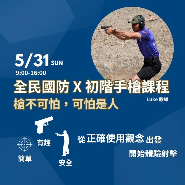 5/31 9:00-16:00 《槍不可怕,可怕是人》Luke教練帶你了解如何安全使用槍械,讓你在6小時內順利擊中紅心🎯