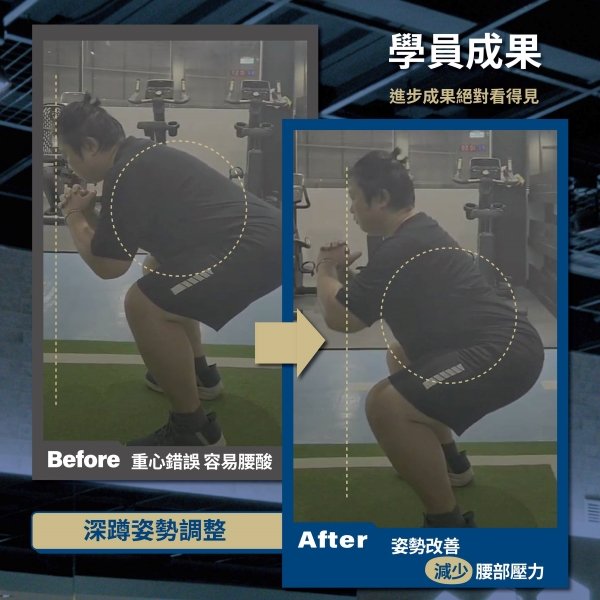 透過教練調整後的動作更加正確且順暢許多,會員也更能抓到深蹲身體的控制。