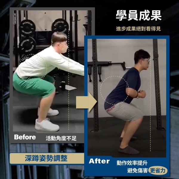 Miles教練發現會員對於深蹲動作不熟悉,下蹲時骨盆會有後傾的現象,重心向後為了平衡身體而過度向前。