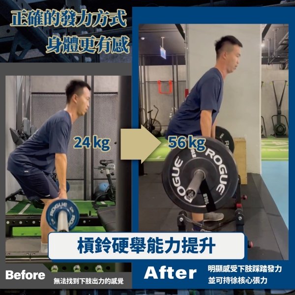 訓練1個月後,槓鈴硬舉重量提升至56KG,也能在動作中明顯感受到下肢踩踏地面的感覺,並能在所有動作角度中維持核心張力。持續的運動,身體會有越來越好的感受!