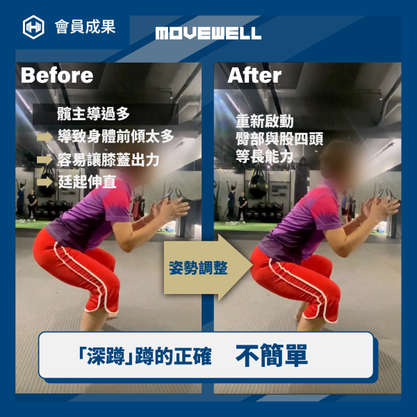 會員進行深蹲訓練時,膝蓋常常會有不舒服的狀況,也出現蹲不下去的感覺。