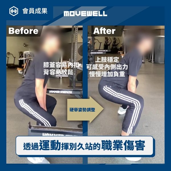 會員因工作需要久站,容易有腰酸不適,因此來動動好上課,希望透過增肌減緩不舒服。