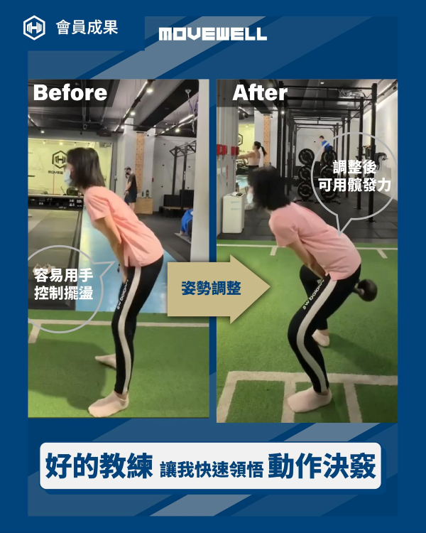經過再次觀察Darren教練的動作與提示語,想像著硬舉後面的挺直收尾及橋式的臀部用力,使壺鈴擺盪至水平後自然落下。節奏平均後再像盪鞦韆似的由後往前,終於抓到決竅使整體動作流暢度漸佳。
