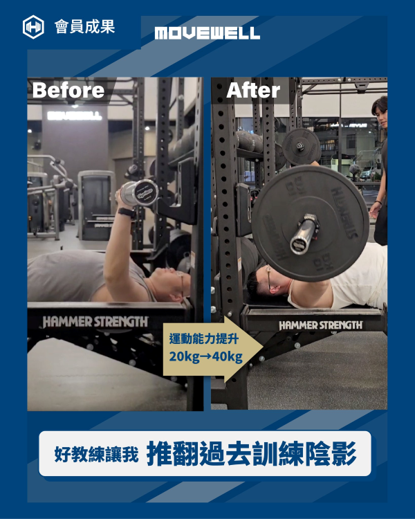 幸好在動動好適能訓練中心,跟著Nick教練訓練的這段時間,不僅順利突破恐懼,訓練品質與穩定性更是大幅提升。讓我可以從20公斤推到40公斤,也能穩定的讓胸肌去發力不會造成肩膀的不舒服👍