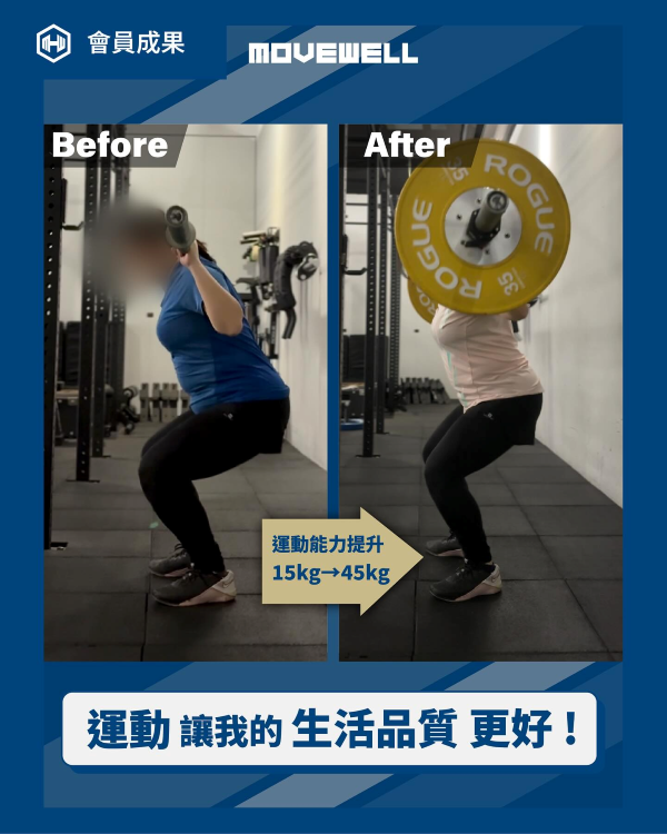 到目前為止持續每週上 Beck教練的課已經有一段時間了,我最大的感受是以前受過傷的右膝總是很容易在曲膝維持一段時間後就會發痠不舒服,例如在電影院看電影時,要久坐 2 個多小時,膝蓋就會不舒服,但經過 Beck教練安排我做的訓練,現在膝蓋會痠的情況已經改善了很多,看電影時再也不會覺得不舒服了,能好好享受看電影的樂趣。除此之外,我也發現透過運動重訓,對生活有極大的幫助,養成了肌肉,生活中很多需要出力的動作,我都能比以前輕鬆應對,在心理方面幫助更是大,運動重訓時只需將注意力放在目前的動作訓練上,可以什麼事都不要想,其實是很有抒壓效果的,目前的我依然持續上課中,因為我希望老了之後,我是一個健康有肌力能自行做很多事,不需要事事依靠人家的人。