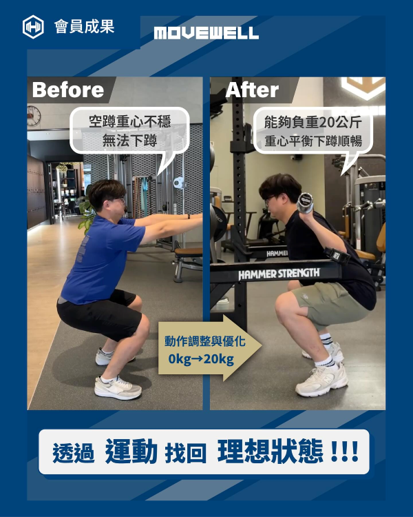 因為長時間坐辦公室的壓力,體重也悄悄上升。現在,穩定的訓練不僅讓我的腿部變強,整個身體也輕盈了不少。 運動不僅能讓我找回狀態,也能提升生活質感。期待未來繼續進步,迎接更多挑戰!