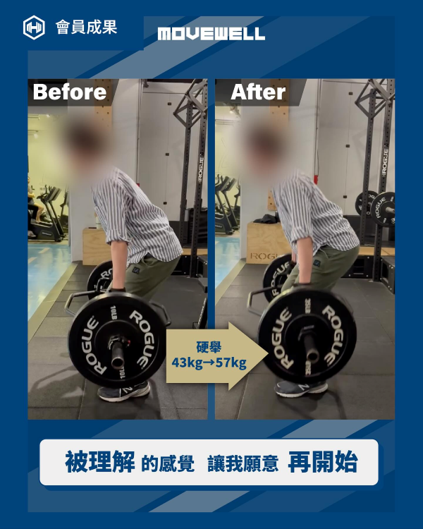 從一開始六角槓硬舉43公斤就覺得吃力,到現在能穩穩拉起57公斤,我不只身體變強壯,連心態也更有力量!看到鏡子裡越來越緊實的自己,我知道,堅持的每一刻都值得。