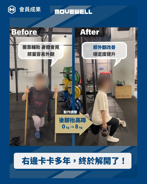 透過Shawn教練檢測,發現不是沒力氣,而是右側身體習慣性歪掉、骨盆往前、膝蓋往外跑,因此先找回重心,讓身體學會站穩、再出力。除了課表外,真正進步的關鍵點是自律。每一次上課前,都確實完成指定熱身,平常也減少久坐,有空就起來動一動。這些看起來很日常的小習慣,卻一點一滴,讓身體開始改變。