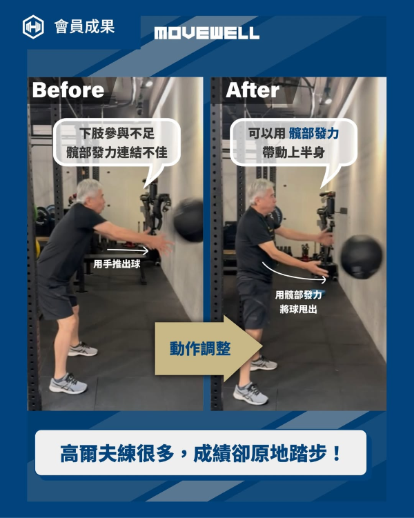 平時有固定進行高爾夫訓練,有不錯的肌力基礎,但實際揮桿卻常使不出來力量、動作不順。
