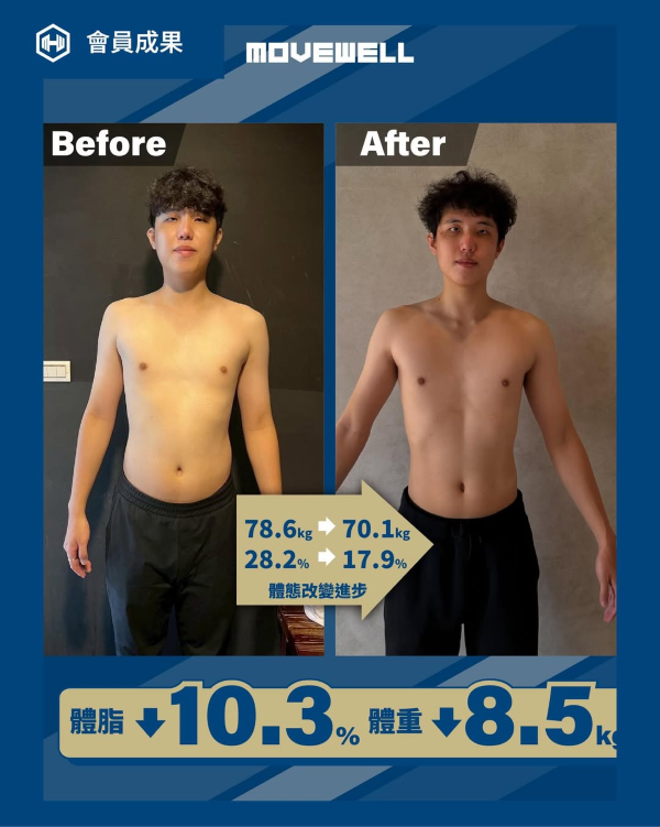 除了每週固定上2次教練課,還外加自主訓練與有氧訓練,課堂間也會詢問健康飲食的觀念。短短半年間,不只體態變化明顯,日常的續航力更持久,體態也挺拔許多