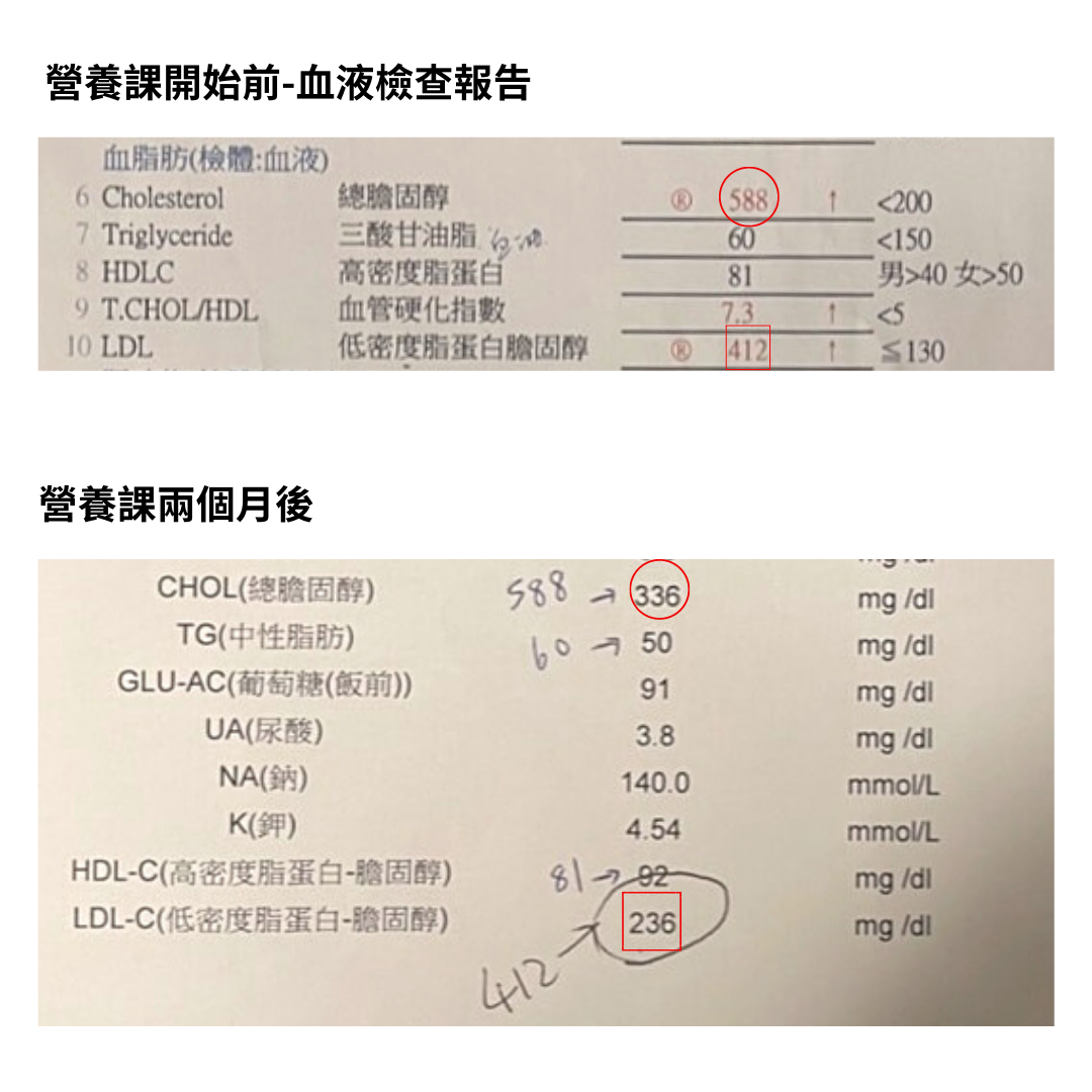 因自己有「膽固存過高」的問題,透過芷寧營養師規劃食療方式,執行兩個月後,總膽固醇從588降到336,LDL也從412降到236!雖然起初本意不是要降膽固醇,是為了虛榮的腹肌,但要有健康的本體才能去做更多進階的挑戰。謝謝芷寧一直擔心我的身體狀況,尤其在前期磨合的時候自己也很焦慮,對於飲食規劃會提出各種問題,芷寧總是很有耐心的回答。雖然離腹肌還有一段路要走,我也會繼續堅持下去的~💥只要你願意 動動好營養師幫你達成目標💥👩⚕Rena營養師官方Line帳號 @970ssaiw