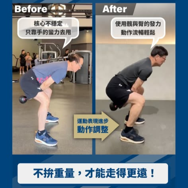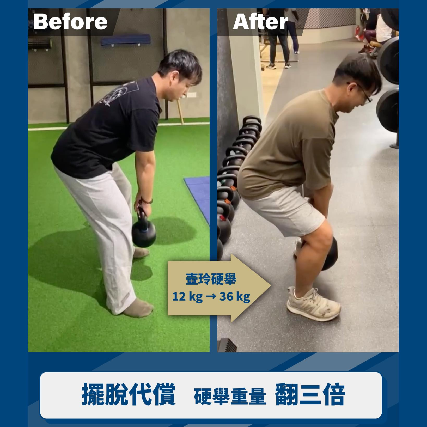 會員過去壺鈴硬舉用8到12公斤時,常因駝背和核心無力造成腰痛。長期久坐和坐姿不良,讓骨盆歪斜問題更加明顯。