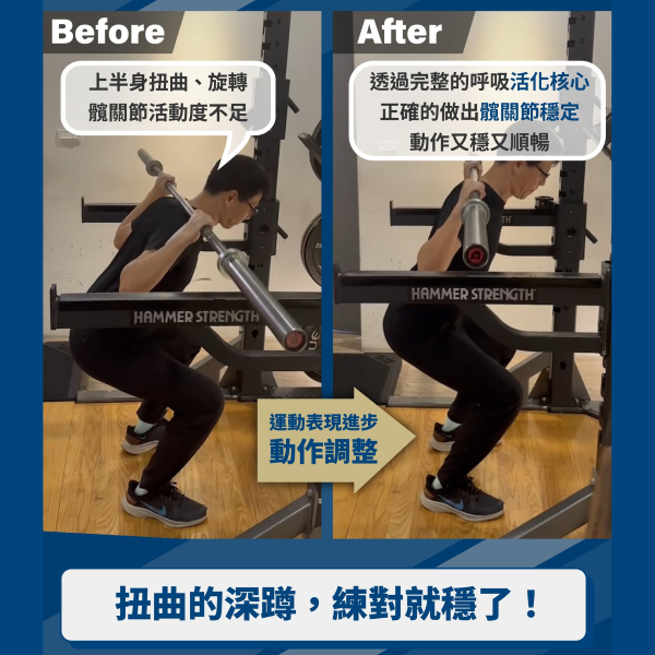 這位會員剛開始運動時,深蹲後腰會痛,身體也常因帶狀疱疹後遺症感到不適。但她沒有放棄,在Herbie教練的細心帶領下,慢慢學會核心出力、身體協調。